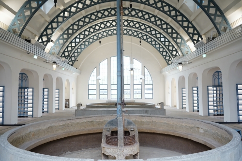 鍛冶工場啟用於1935年,為臺北機廠內負責鍛件製造與熱處理的重要單位,主要執行鍛造、試驗及彈簧修製等工作。建築採鋼骨鋼筋混凝土結構,具防火、防震與減塵功能,是當時重工業建築的代表之一。工場內以「打鐵」為主,利用高溫軟化金屬後再行壓鑄成形,廣泛應用於高強度機械零件製造。館藏重機具多具歷史價值,其中包括英國Barack Raph Co.於1889年製造之蒸汽鎚,仍可見「RIGBY‘S PATENT」銘刻。工場設有蒸汽與壓縮空氣輸送系統,以提升效能並避免管線破裂,展現臺灣早期工業技術的精密與智慧。